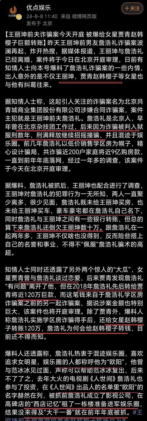 詹浩礼前科累累,此次终于栽了。网友说王丽坤运谈差,嫁错东谈主。她责任室强调她没参与,遵纪称职。案子辅导环球,买房要留意,别信廉价诱骗。