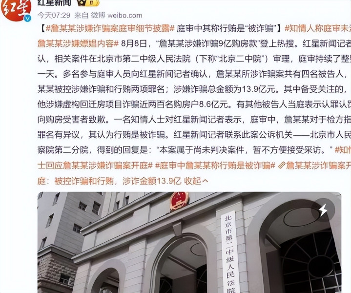 2024年8月,北京二中院开庭,詹浩礼承认糊弄和嫖娼。巡逻官念罪名,他站着听。受害者代表出庭,说耗费大。庭审后,等判决。