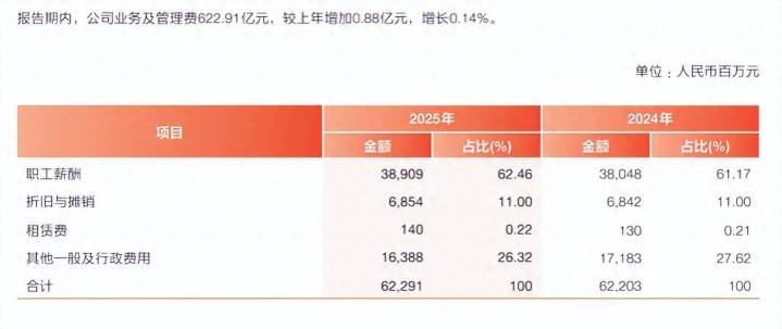 业务用度增多,董事长、行终年薪疏导。2023年、2024年,兴业银行业务及贬责用度邻接两年下滑,差别为626.08亿元、622.03亿元,这种情况在2025年有所编削,同比微增0.14%至622.91亿元。