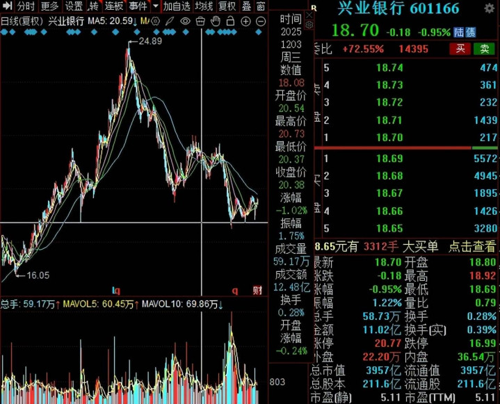 年报暴露次日(3月27日)兴业银行股价小幅着落,时刻跌幅一度超1%,最终收跌0.95%,股价18.7元/股(前复权,下同),总市值3957亿元,TTM市盈率5.11倍开云app,进一步来看,股价自2024年11月以来呈现“倒V”走势,在达到24.89元/股的高点后,迎来了较万古期的着落,收盘价较高点跌幅近25%。