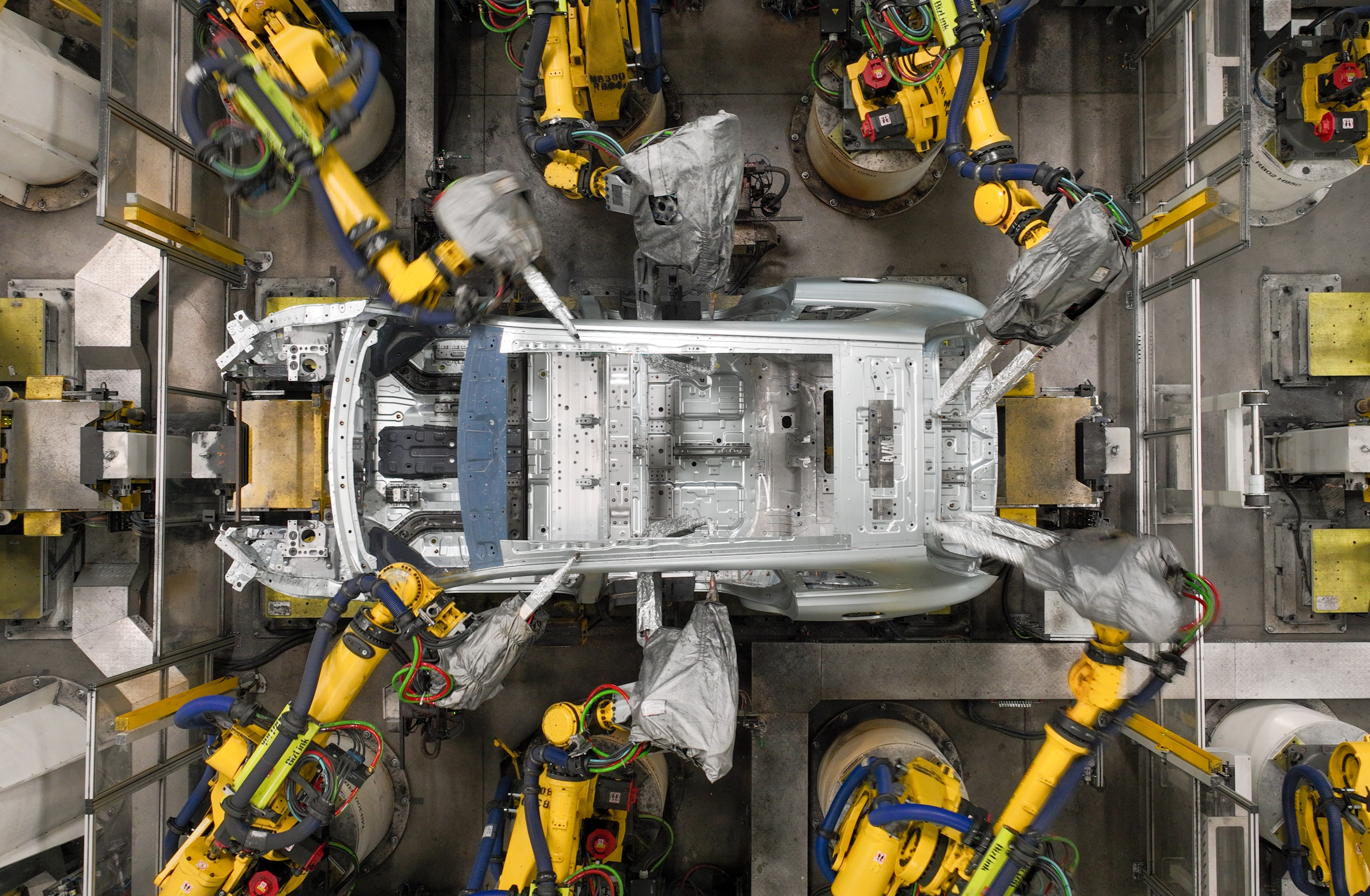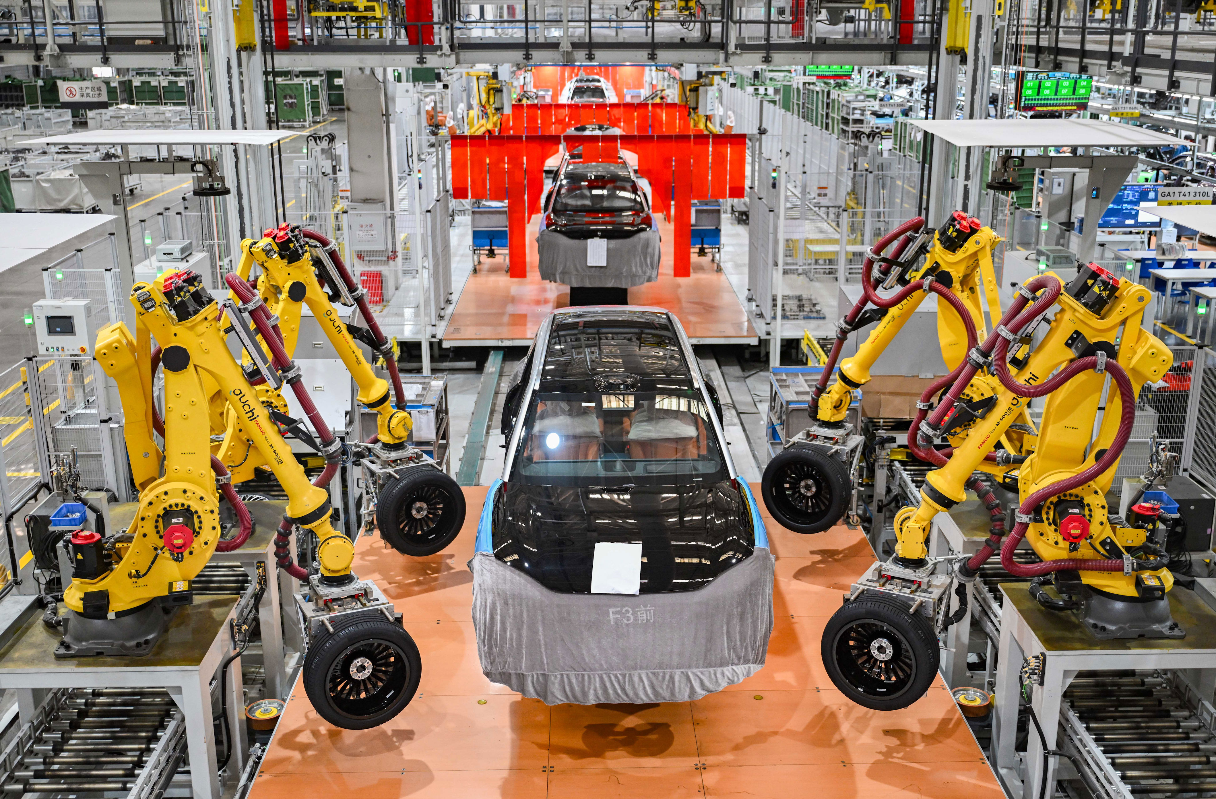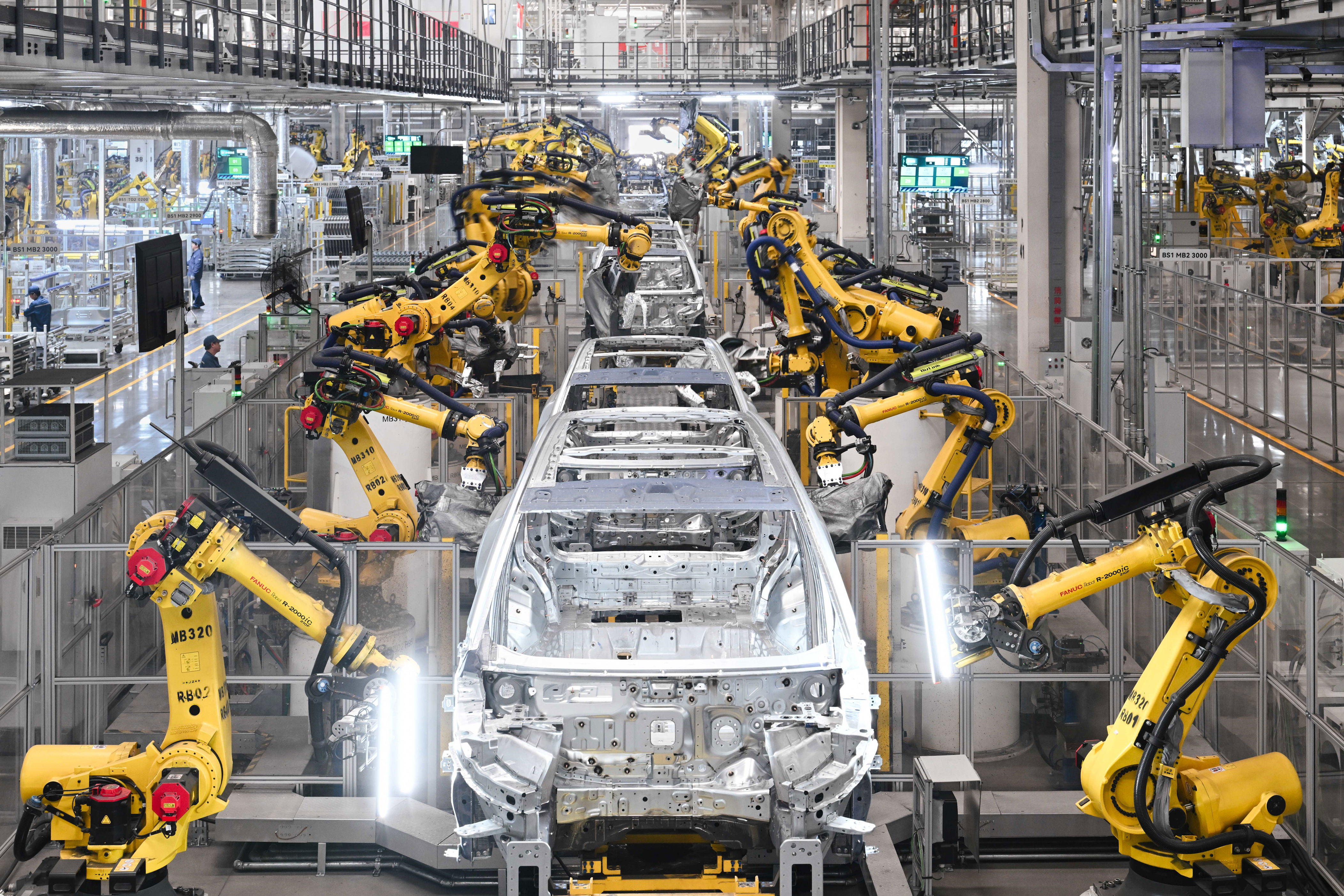 ▲4月8日,位于两江新区龙盛新城的赛力斯汽车超等工场开云app,焊合车间的机械手臂正在费力功课。记者 张锦辉 摄