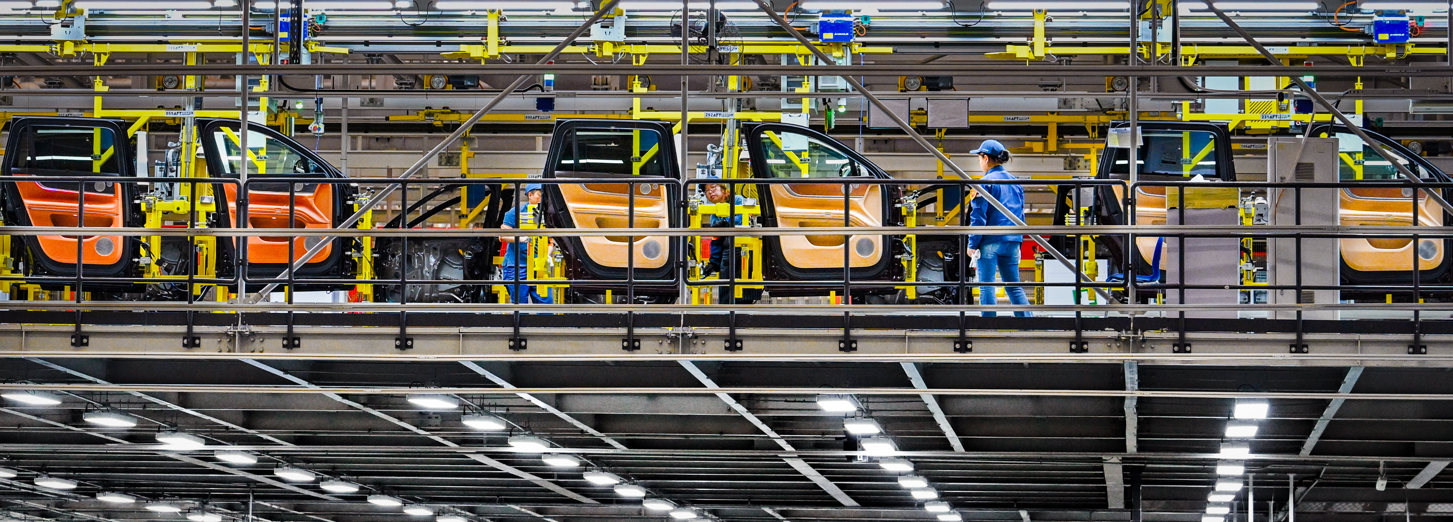 ▲4月8日,位于两江新区龙盛新城的赛力斯汽车超等工场,底盘线工东说念主与吊挂式运输建立配互助业。记者 张锦辉 摄