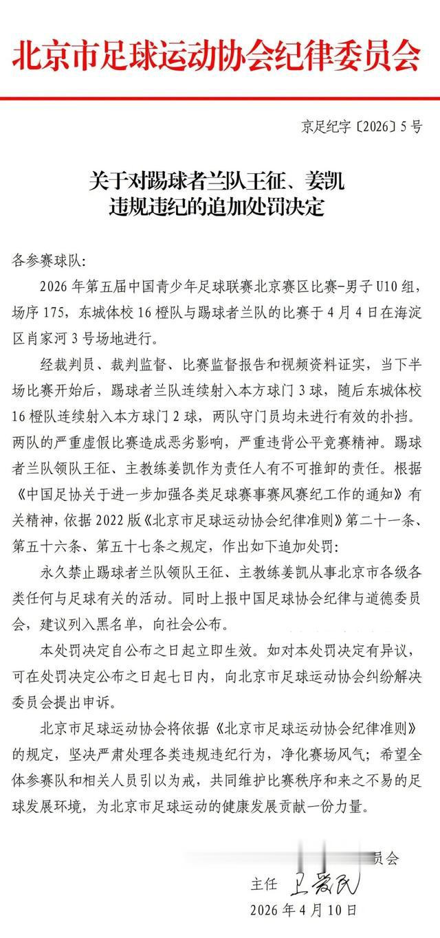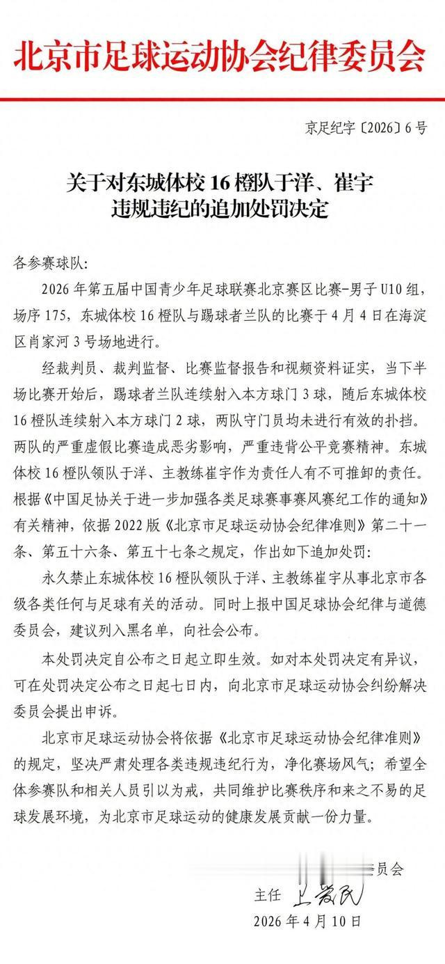 开云官方体育app官网 中青赛U10组假球引温雅 北京足协晓示追加责罚 改为永久禁赛