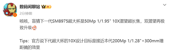[CNMO科技音书]4月9日,数码博主“数码闲话站”揣度某一品牌下一代搭载“SM8975”(认真称号瞻望为“骁龙8EliteGen6Pro”)的超大杯机型,将配备5000万像素1/1.95英寸的10×潜望超长焦镜头,双潜望长焦镜头成立再次升级。