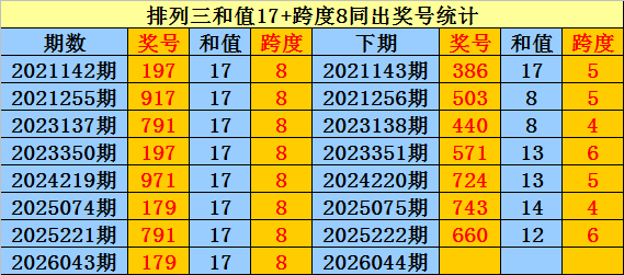 罗列三近8次和值17+跨度8同出时奖号为:197、917、791、197、971、179、791、179,下期别离出现:386、503、440、571、724、743、660。