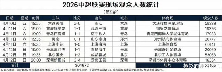 第5轮中超现场不雅众总东谈主数达到264872东谈主,场均33109东谈主,名次中超历史单轮现场不雅众总东谈主数的第3位。