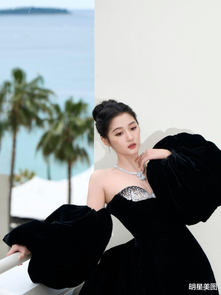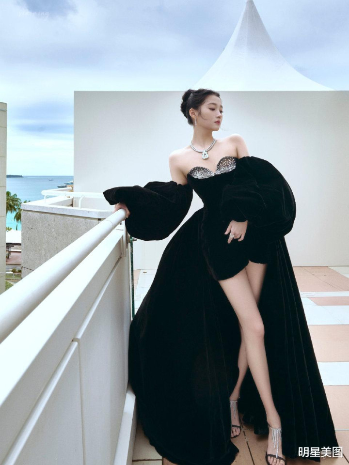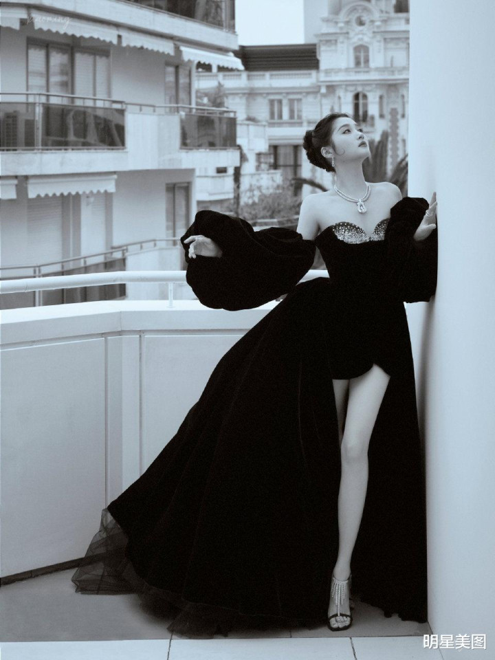 关晓彤南法黑丝绒封神!抹胸闪钻+大裙摆,气场全开