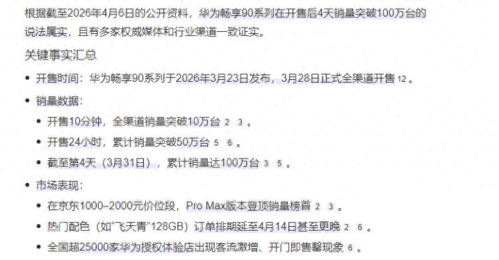 华为绝对转头了,不啻是旗舰,我今天想讲的是性价比产物,主要已经来自畅享90系列,那时我还不信,历程查询发现如实音信属实,4天凯旋销量干到100万台