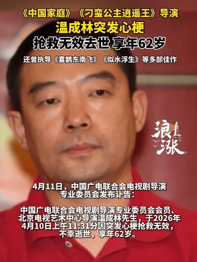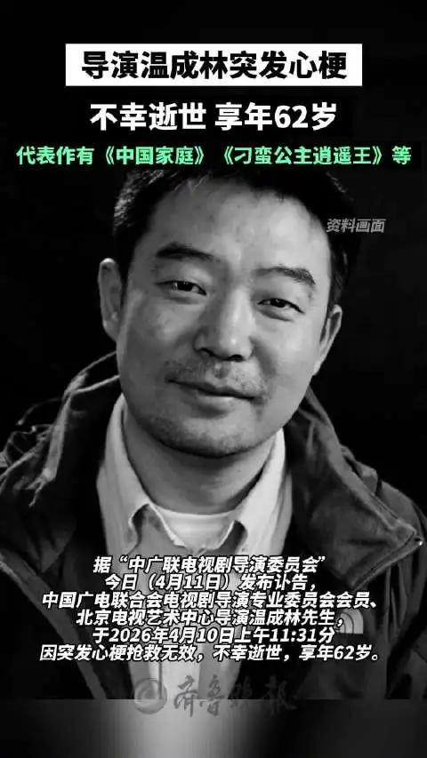 4月11日,中广联电视剧导演委员会发布讣告:4月10日,导演温成林因心梗离世,享年62岁。