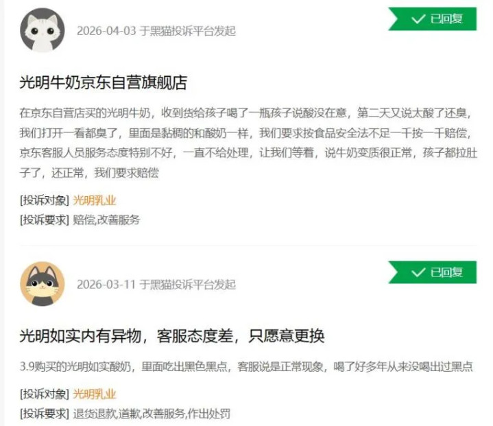黑猫投诉平台数据深刻,圮绝4月7日,触及光明乳业的投诉量达568条,内容聚合指向结块、变质、异味、异物等问题,其中大量投诉尚未完成解决。