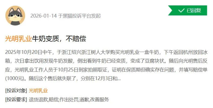 另有耗尽者投诉称,2025年10月20日,其于浙江绍兴购买光明乳业一盒牛奶,下昼复返杭州放回雪柜,次日拿出饮用发现牛奶依然变质,变成了“豆腐块状”。该耗尽者强调,从绍兴开车到杭州仅需40多分钟,当日最高温度也不向上20℃。该耗尽者关连了售后,光明乳业使命主说念主员于10月25日到家拍照取证,阐发家具在保质期但照实存在问题,并填写补偿单(1000元)。随后售后东说念主员失联,该耗尽者离别在12月3日和24日关连售后均未取得顶住。再次关连光明总部,售后才回话,并以“他乡购买”为由拒赔。