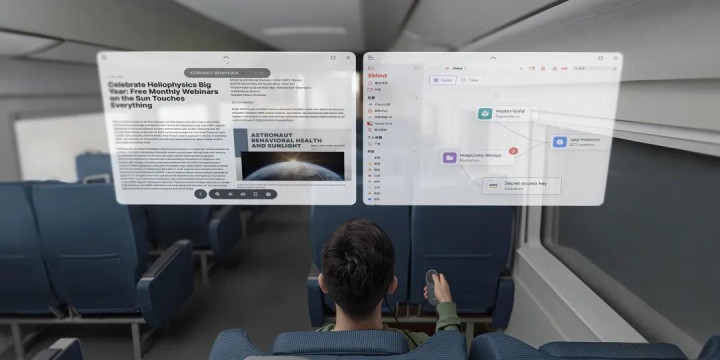INAIR Pod 治理的恰是这个算力和系统的缺位。通过硬件直连,INAIR Pod 能在职何局促的环境中铺开最多 6 块造谣屏幕。3DoF 空间悬停时间让这些屏幕清静在物理空间中,头部动弹切换视野,不会产生昏厥感。你转头看向左边,就能看到左边挂着的参考贵府;转回正前列,则是正在输入的文档。